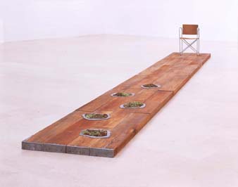 RADEAU 1996 bois, plomb, plantes ; pliant : acier et cuir, 81,5 x 96,5 x 818 cm
